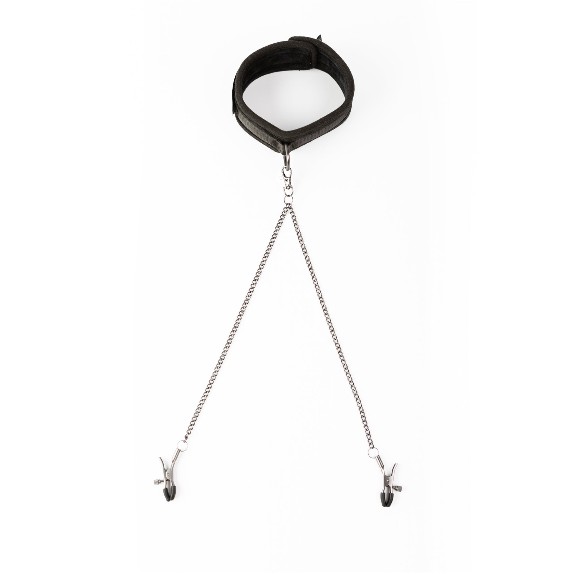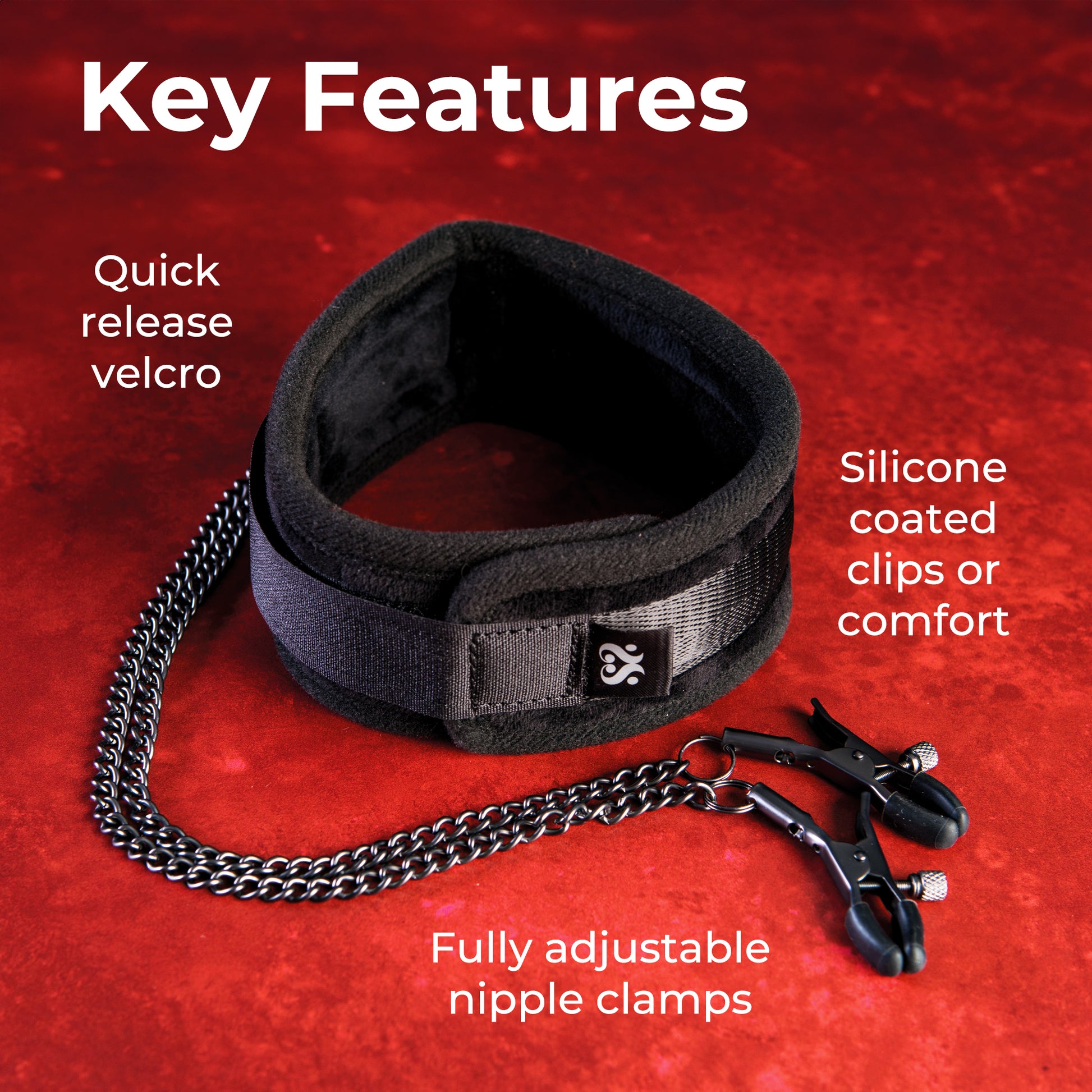 The silicone-tipped nipple clamps provide a pleasurable pinch, with adjustable screws allowing you to fine-tune the pressure from gentle to more intense. For added versatility, the clamps detach from the collar and can be used on their own, giving you plenty of ways to explore your desires.
